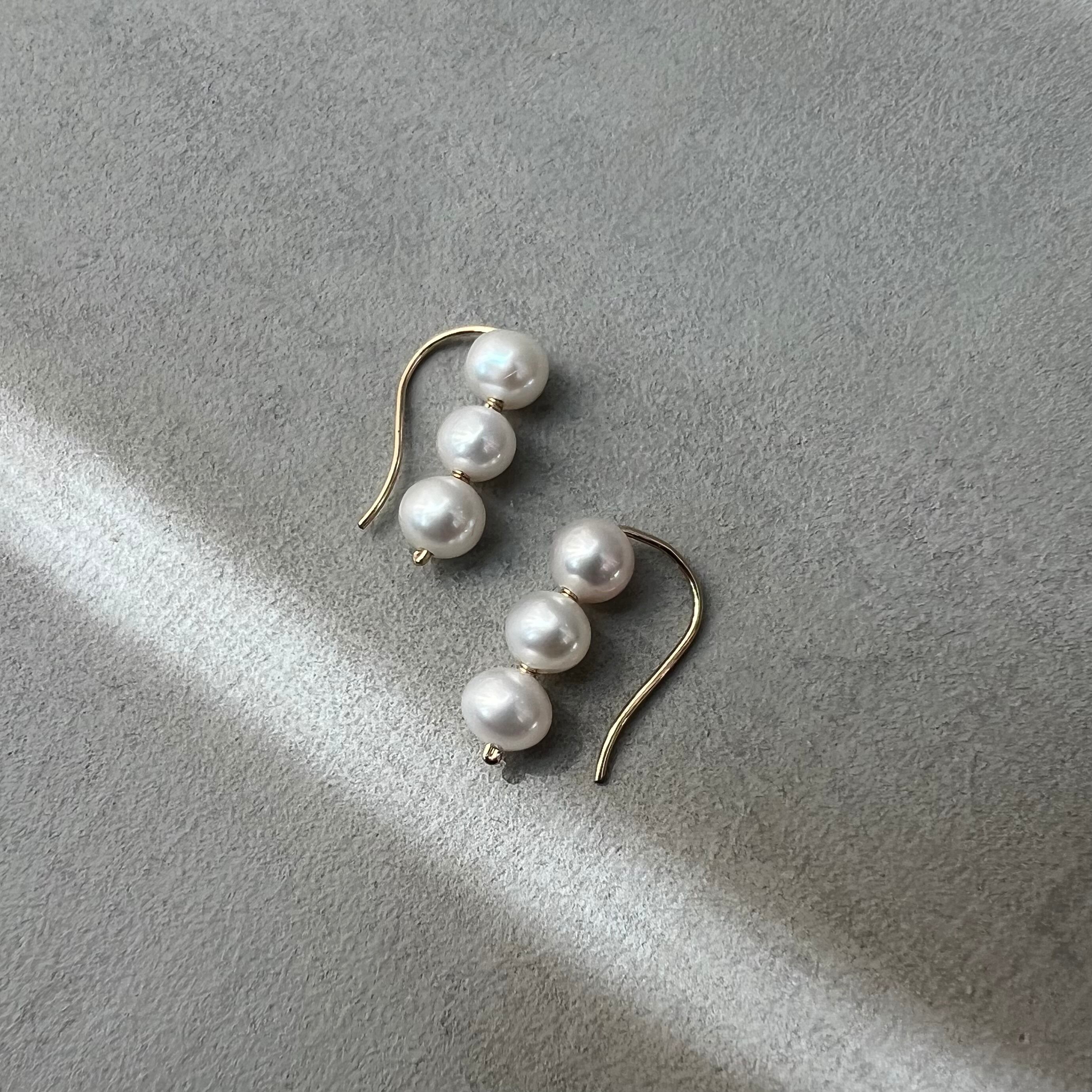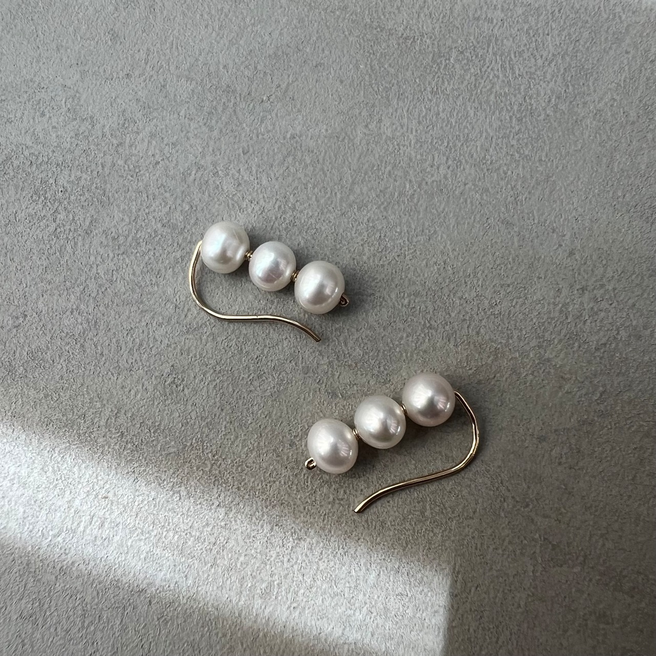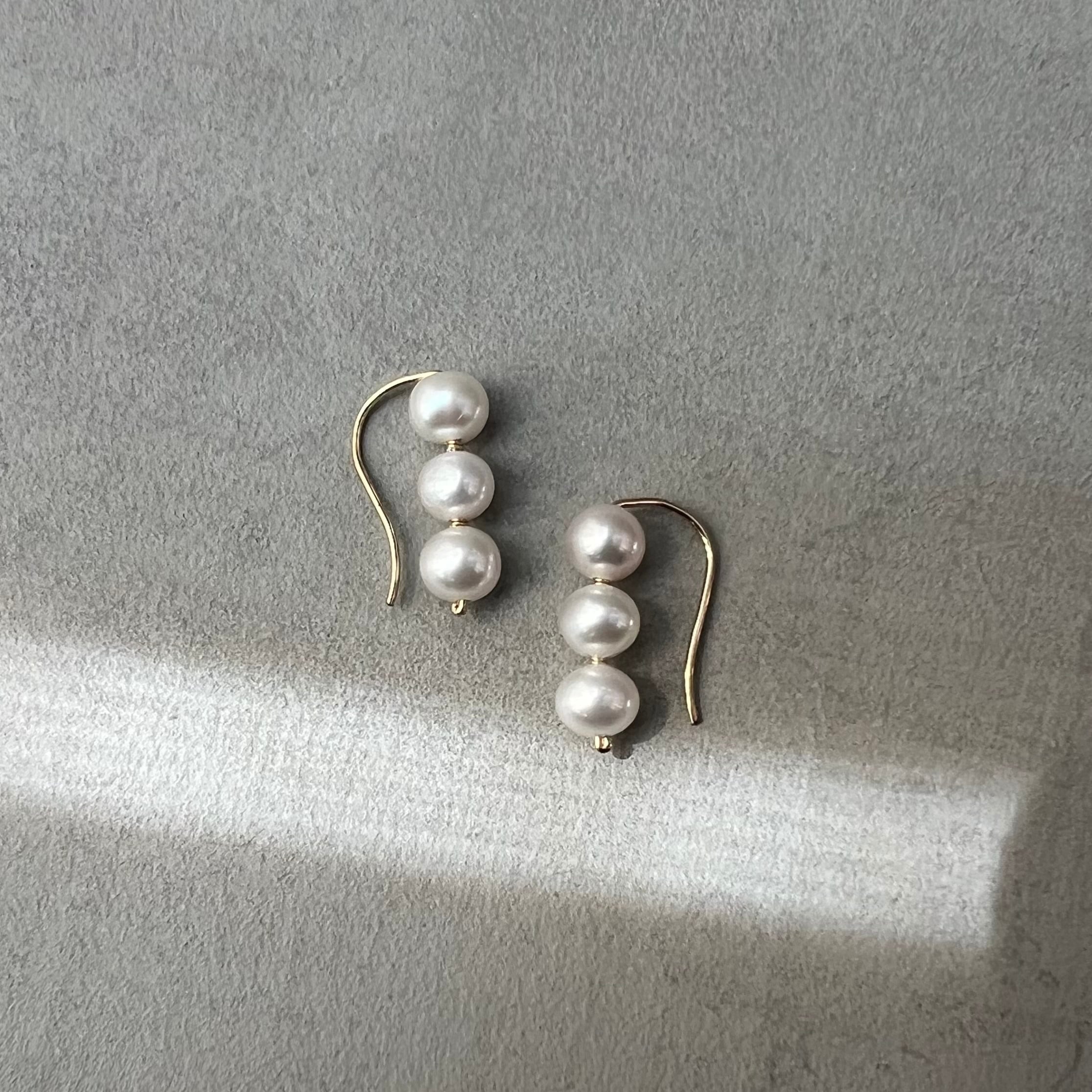 ワイヤーの太さも少し太くし、パールひとつひとつを丁寧に穴あけし、両耳3連パールで合わせやすいデザインに仕上げました。